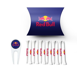 Revo Pillow Pack Customised. Includes a card pillow pack (400 gsm paper from sustainably managed forests) which is fully customised with your logo printed up to full colour, packed loose with 12 x white 70mm shank printed tees, printed up to 3 colours & 1 x Revo repair tool with 25mm black nickel removable full colour resin dome ball marker