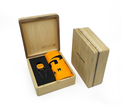 Towel Quatro Repair Tool Mini Hinged Magnetic Bamboo Presentation Box with full colour print to the middle of the lid packed with 1 x Dormi Players (TT7002 open towel) or Dormi Tri Fold towel (TT7003) printed up to full colour on 1 side and 1 x Quatro repair tool with 26mm gunmetal square removable up to full colour resin dome ball marker. The tool is sat in an EVA insert in the box. Towel upgrade to either a waffle embroidered towel or a rear background print on the Dormi towel available for additional costs