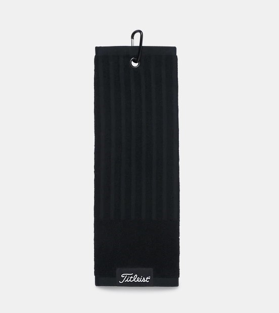 Titleist Tri Fold Golf Cart Towel with carabiner. Terry material with ribbed pattern. Titleist logo to the bottom of the towel and your logo to 1 position at a maximum of 75mm diameter. Towel size approx. 400mm high x 270mm wide (if the towel could be open it would be 810mm wide), MOQ 12. Plain stock is available, please ask for a price. Non-stock product, so stock subject to availability